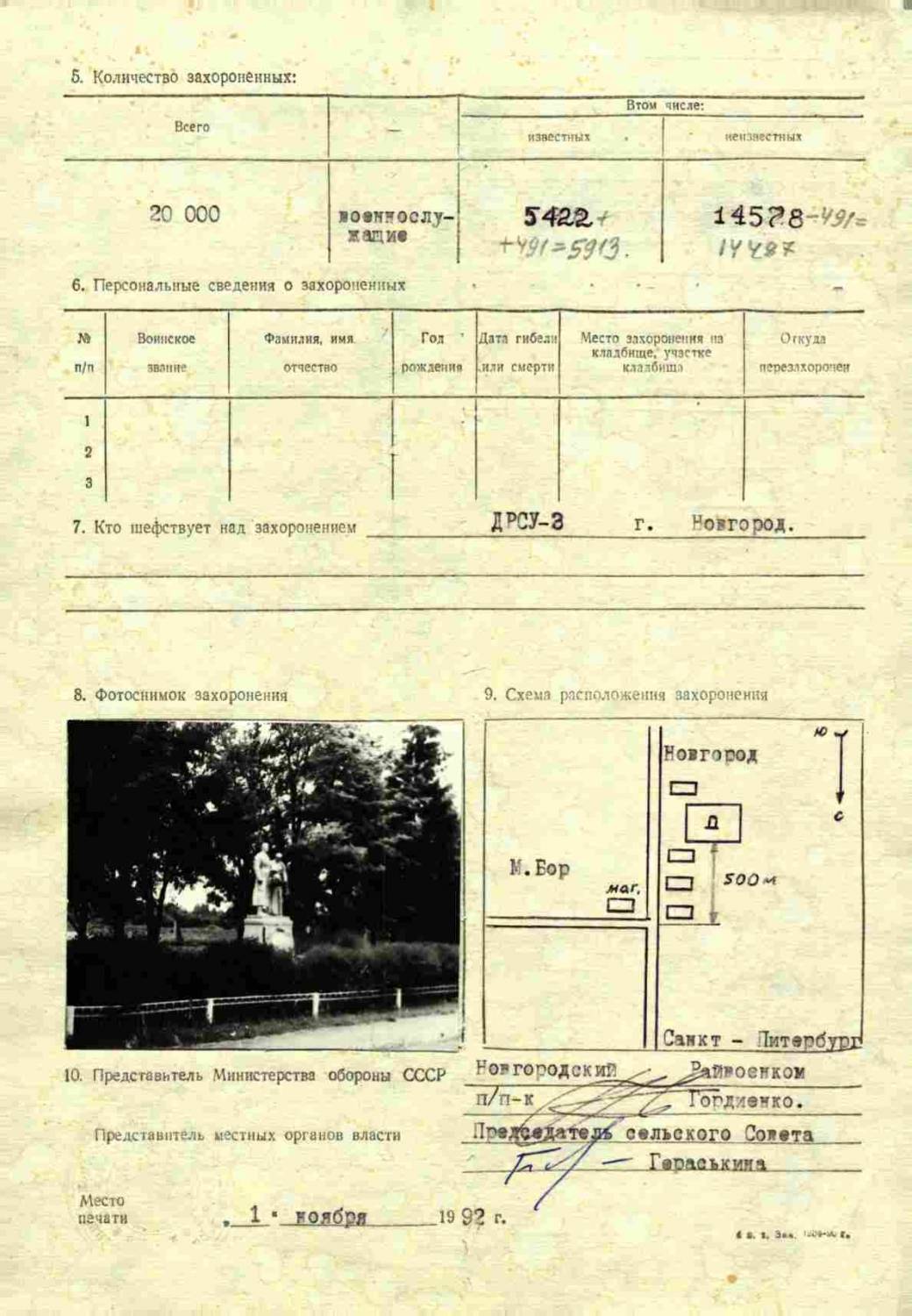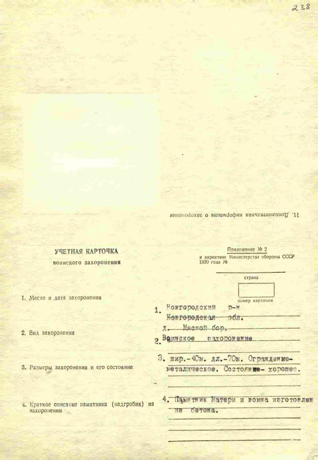 Sveta12, Страна захоронения Россия Регион захоронения Новгородская обл. Номер захоронения в ВМЦ 53-238 Место захоронения Новгородский р-н, центр д. Мясной Бор Состояние захоронения хорошее Захоронено всего 20000 Захоронено известных 5913 Захоронено неизвестных 14487 Кто шефствует над захоронением ДРСУ-3 г. Новгорода