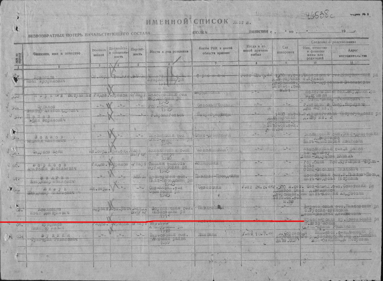Цитата (irysikvdpo) Помогите найти информацию о моем прадедушке...ФамилияКозловцев ИмяИван ОтчествоДмитриевич Дата рождения/Возраст__.__.1914 Место рожденияВоронежская обл., Павловский р-н Дата и место призываПавловский РВК, Воронежская обл., Павловский р-н Последнее место службы26 Гв. сд После войны перезахоранивался сюда.