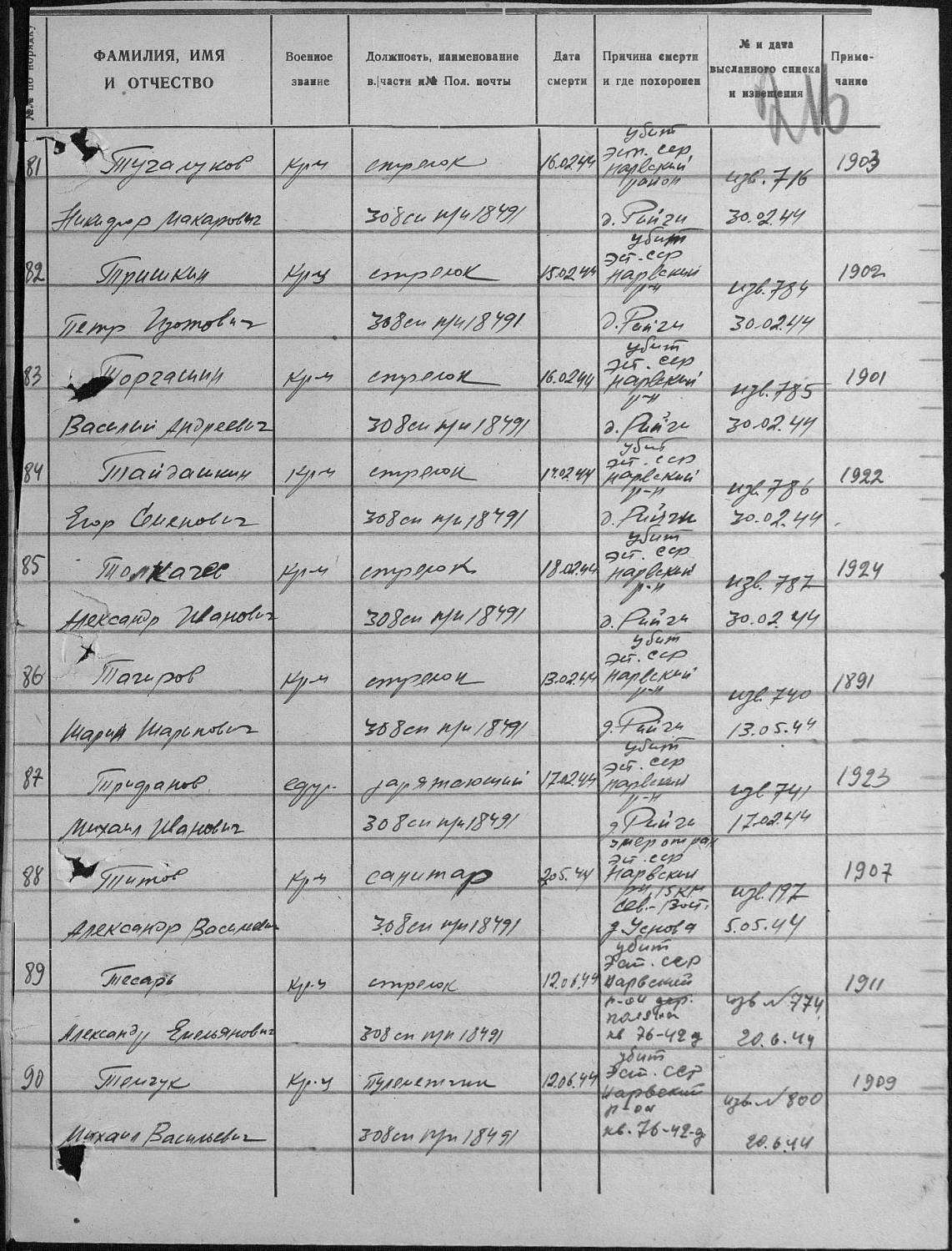 Да, сохранилась (извещение N7 от 28.12.42 г). Мне бы хотелось ещё узнать точный год рождения моего деда, ели знаете, напишите, как это можно узнать. Большое спасибо всем, кто помог мне разобраться в информации и в поиске могилы дедушки!
