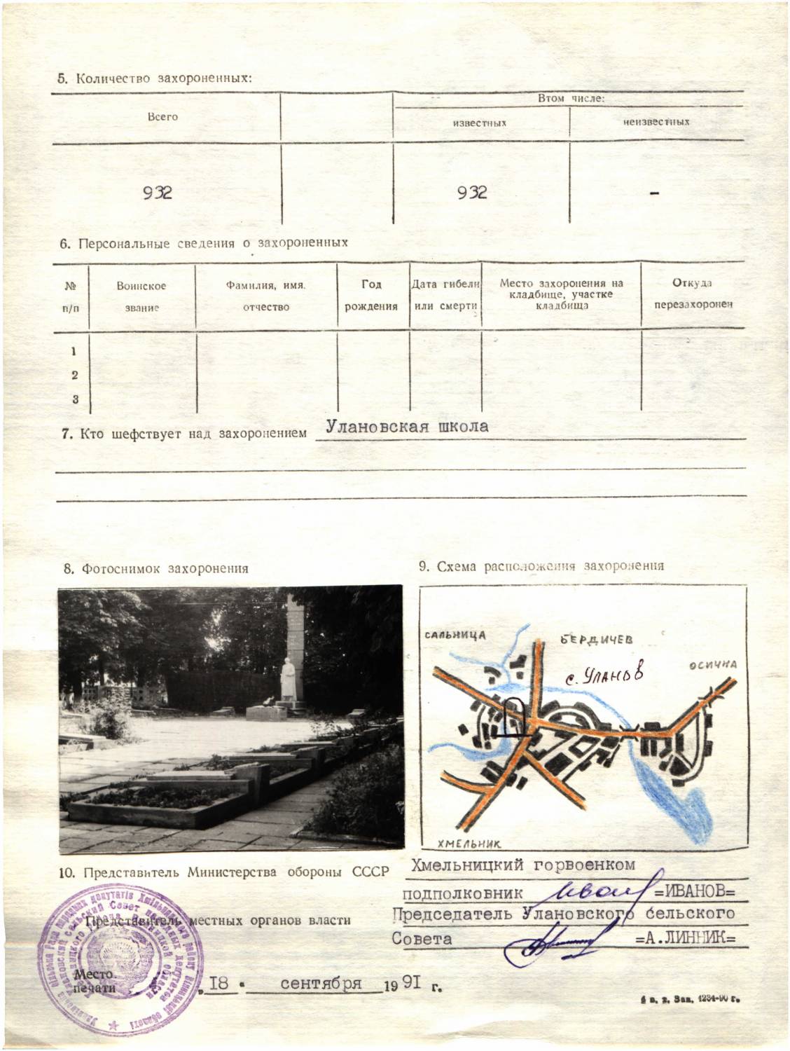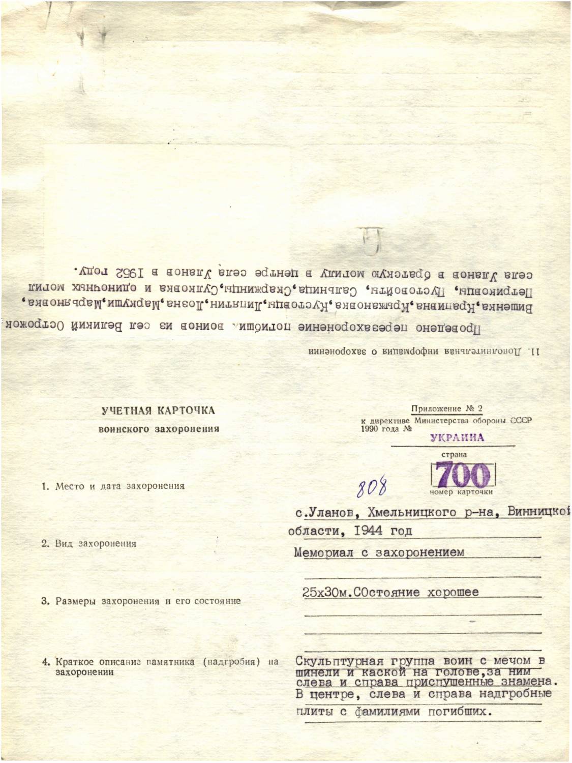Страна захоронения Украина Регион захоронения Винницкая обл. Номер захоронения в ВМЦ ЗУ380-02-808 Место захоронения Хмельницкий р-н, с. Уланов, центр села Дата создания современного места захоронения __.__.1944 Дата последнего захоронения __.__.1944 Вид захоронения мемориал с захоронением Состояние захоронения хорошее Количество могил 1 Захоронено всего 931 Захоронено известных 931 Захоронено неизвестных 0 Кто шефствует над захоронением Улановская школа Откуда производились перезахоронения с. Великий Острожок; с. Вишенка; с. Крапивна; с. Крыжановка; с. Кустовцы; с. Липятин; с. Лозна; с. Маркуши; с. Марьяновка; с. Петриковцы; с. Пустовайты; с. Сальница; с. Скаржинцы; с. Сулковка; с. Воробиевка; с. Вороновцы; с. Зозуленцы; с. Игнатовка; с. Клитенка; с. Морозовка; с. Мытенцы; с. Острожок; с. Осычна; с. Пагурцы; с. Слобода Кустовецкая; с. Смела; с. Ступник; с. Подорожная; с. Хозуленцы; с. Чернятинцы; с. Чесновка; из одиночных могил с. Уланов