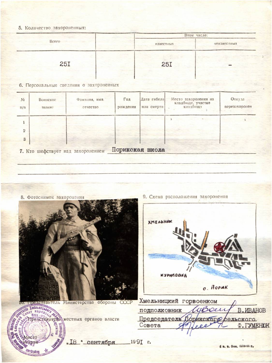 Страна захоронения Украина Регион захоронения Винницкая обл. Номер захоронения в ВМЦ ЗУ380-02-669 Место захоронения Хмельницкий р-н, с. Порик Дата создания современного места захоронения __.__.1944 Дата последнего захоронения __.__.1944 Вид захоронения братская могила Состояние захоронения удовлетворительное Количество могил 1 Захоронено всего 251 Захоронено известных 251 Захоронено неизвестных 0 Кто шефствует над захоронением Порикская школа