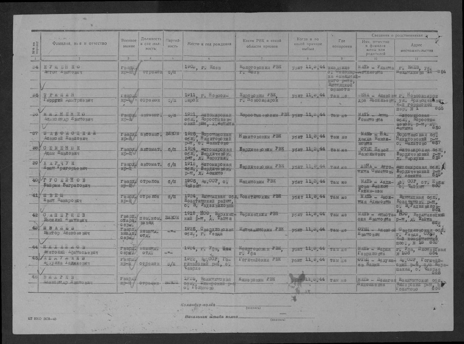 1.Скрипниченко Сергей Васильевич 1917 года рождения г. Баку. Призван в армию 1939 году, последнее письмо полученное от него 8 июня 1941 года, почтовый ящик: БССР Балостокская обл. гор Ломжа, п/о Визно п/я №2 кв 8. Жена Скрипниченко Фаина, проживала в г. Баку.В письме он написал, что получил младшего командира.