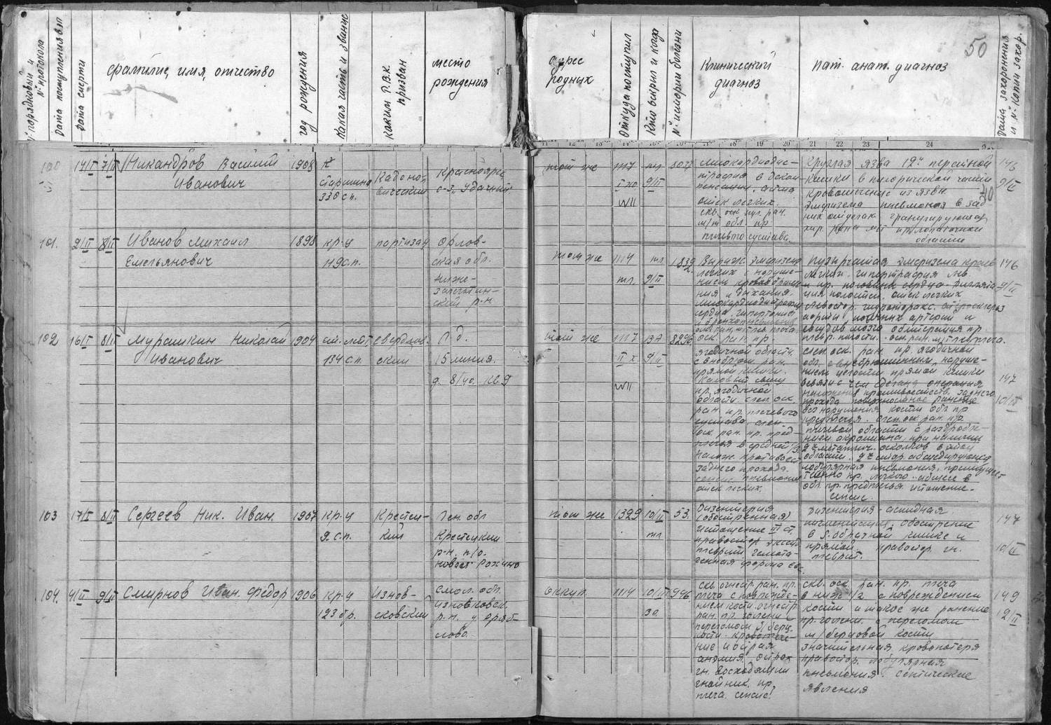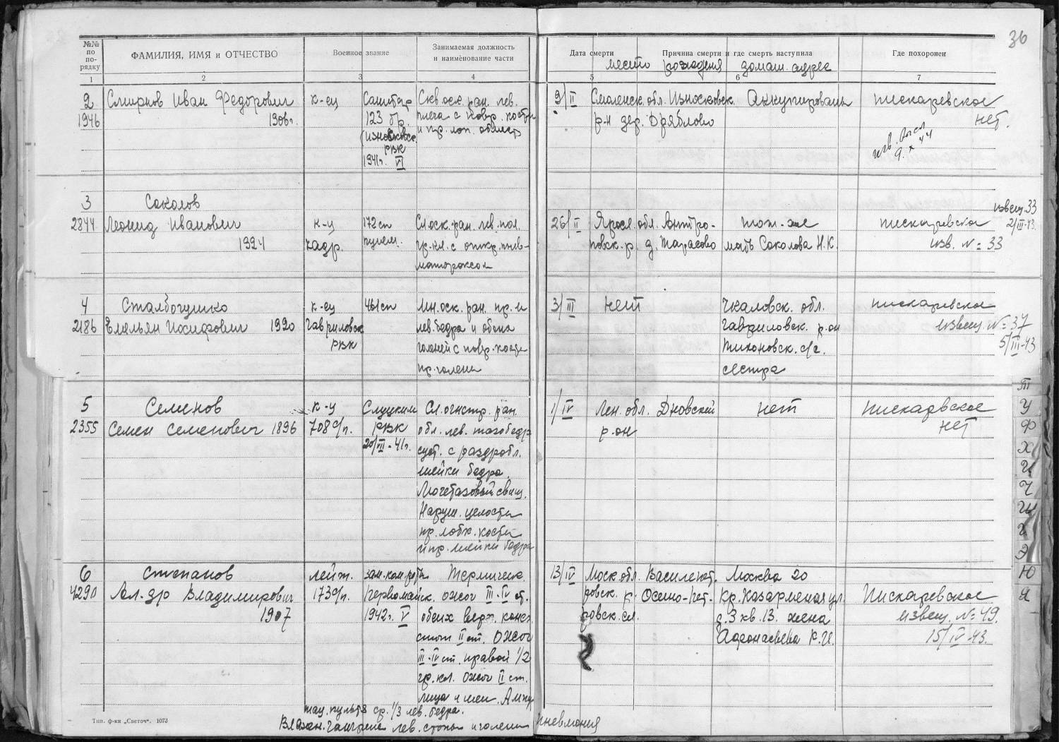 Фамилия Смирнов Имя Иван Отчество Федорович Дата рождения/Возраст __.__.1906 Место рождения Смоленская обл., Износковский р-н, д. Дряблово Дата и место призыва Смоленская обл., Износковский РВК Последнее место службы 123 Бр Воинское звание красноармеец Причина выбытия умер от ран Дата выбытия 09.02.1943 Госпиталь 1117 эг Название источника информации ЦАМО Номер фонда источника информации 58 Номер описи источника информации А-83627 Номер дела источника информации 2656