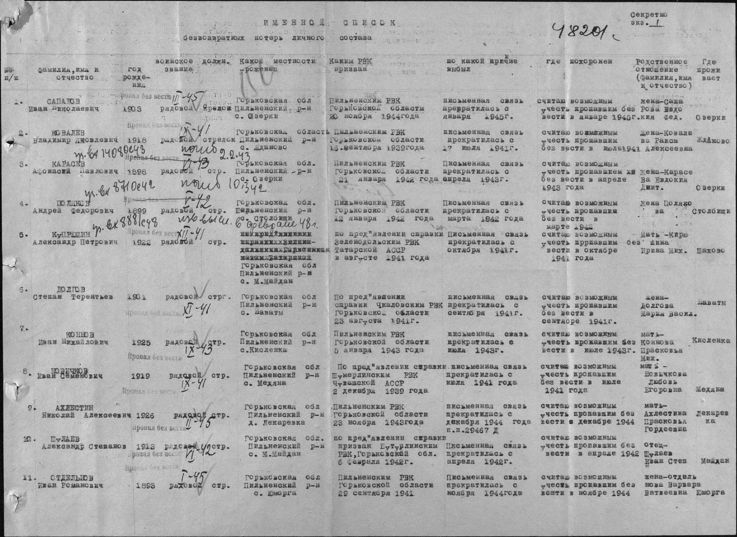 2. Информация с ОБД-Мемориал, хотелось бы узнать приблизительно где именно пропал,может есть какая-то информация расширенная Фамилия Сокирченко Имя Гаврил Отчество Андреевич Дата рождения/Возраст __.__.1914 Дата и место призыва __.01.1942 Широко-Карамышский РВК, Саратовская обл., Широко-Карамышский р-н Воинское звание рядовой Причина выбытия пропал без вести Дата выбытия __.03.1944 Название источника информации ЦАМО Номер фонда источника информации 58 Номер описи источника информации 977521 Номер дела источника информации 269 Очень на вас надеюсь ,заранее благодарю.