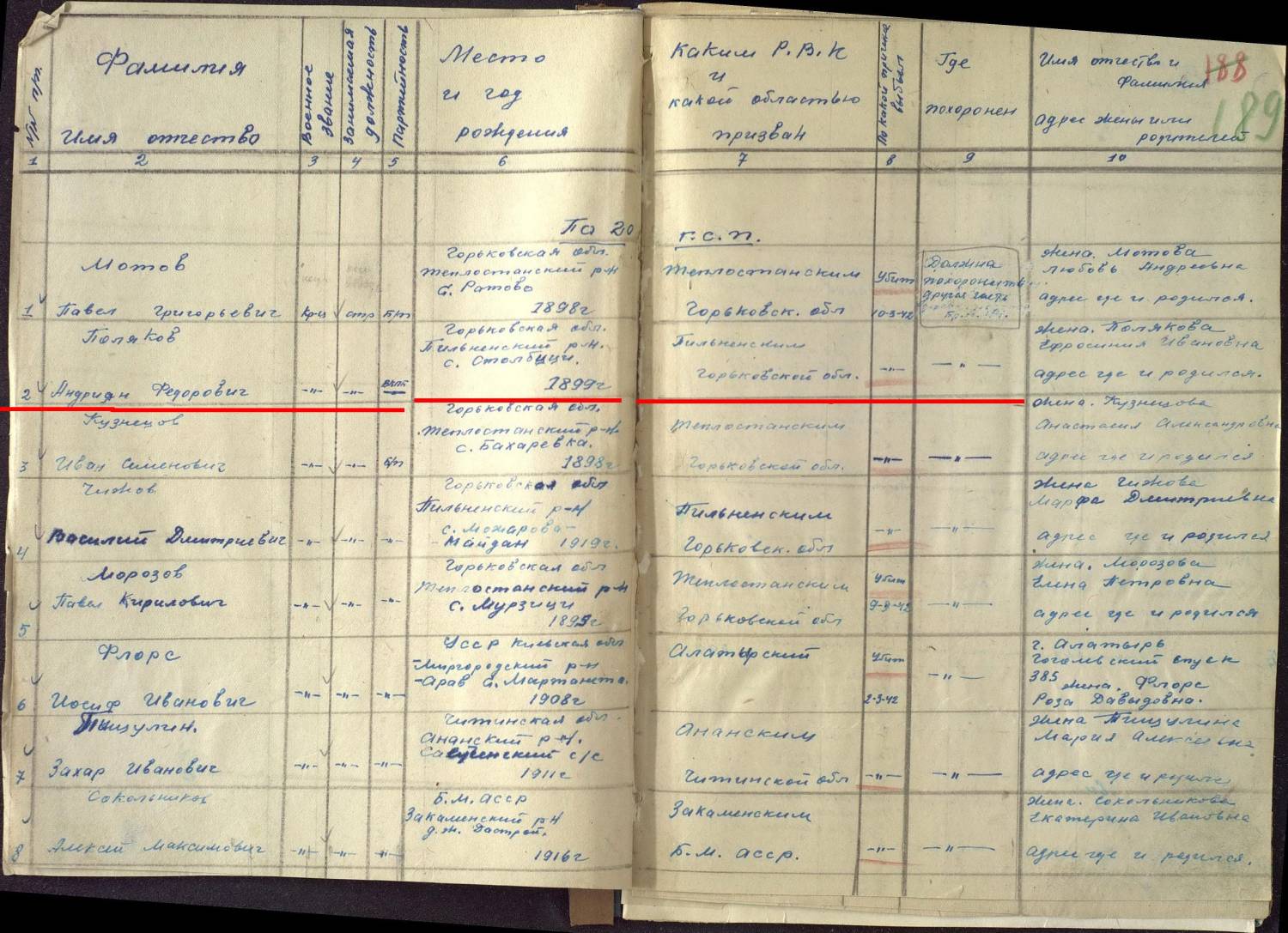 Прошу помочь в поиске места захоронения моего прадеда Поляков Андриан Фёдорович 1899 г.р., уроженец села Столбищи Пильнинского района Нижегородской области. Вот данные с сайта Мемориал: http://www.obd-memorial.ru/html/info.htm?id=403691612 http://www.obd-memorial.ru/html/info.htm?id=51458217 Фамилия Поляков Имя Андриян Отчество Федорович Дата рождения/Возраст __.__.1899 Место рождения Горьковская обл., Пильнинский р-н, с. Столбици Дата и место призыва Пильненский РВК, Горьковская обл., Пильненский р-н Последнее место службы 1 Гв. СК 20 ГСП Воинское звание красноармеец Причина выбытия убит Дата выбытия 10.03.1942 Название источника информации ЦАМО Номер фонда источника информации 58 Номер описи источника информации 818883 Номер дела источника информации 1284