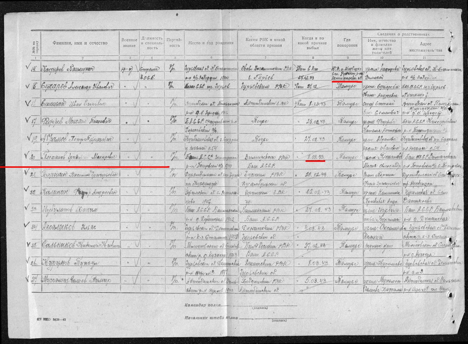 Viktoria, Фамилия ПЛЕХАНОВ Имя Григорий Отчество Максимович Дата рождения/Возраст __.__.1910 Дата выбытия 08.03.1943 Название источника информации Память. Башкортостан. Книга 10