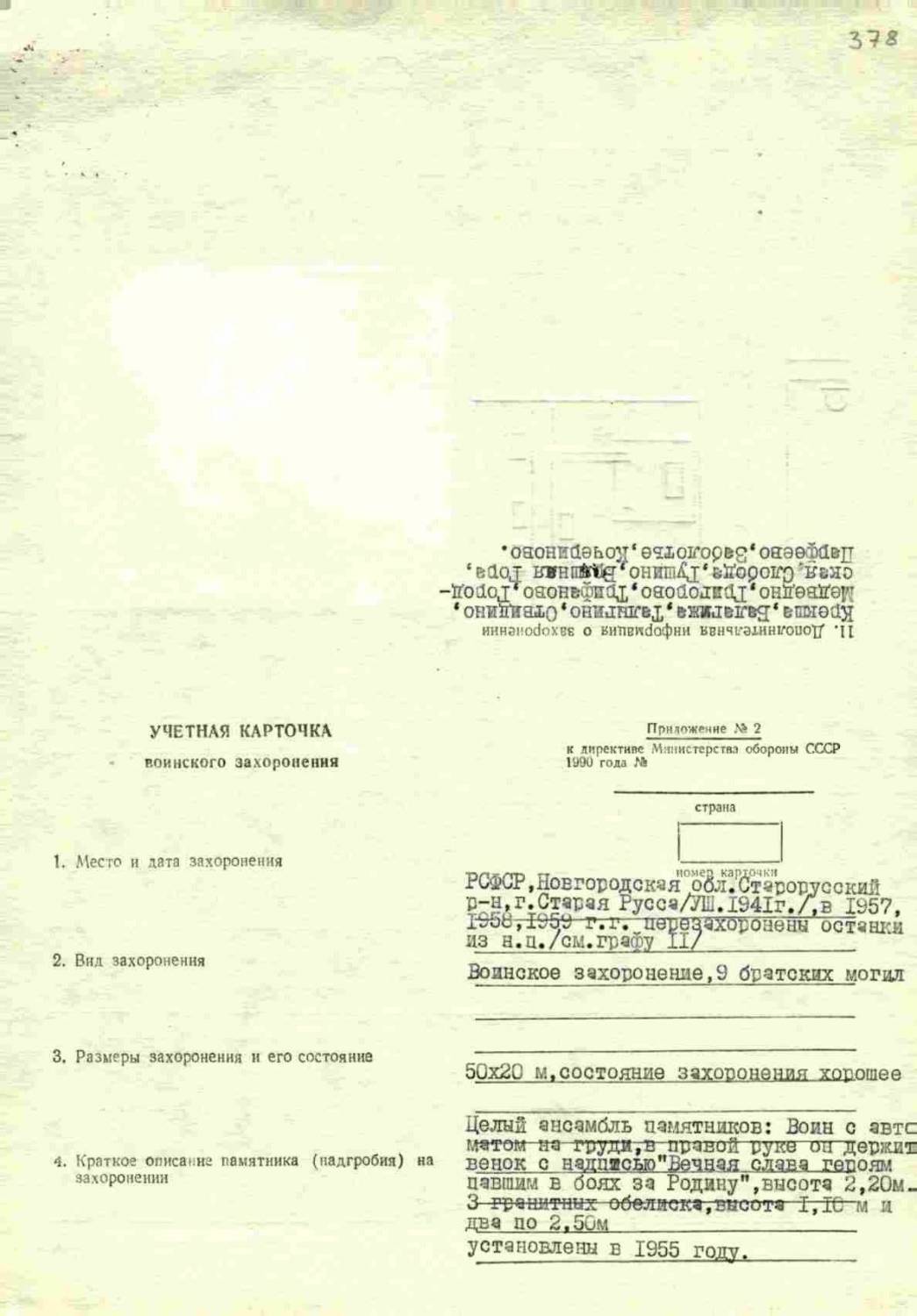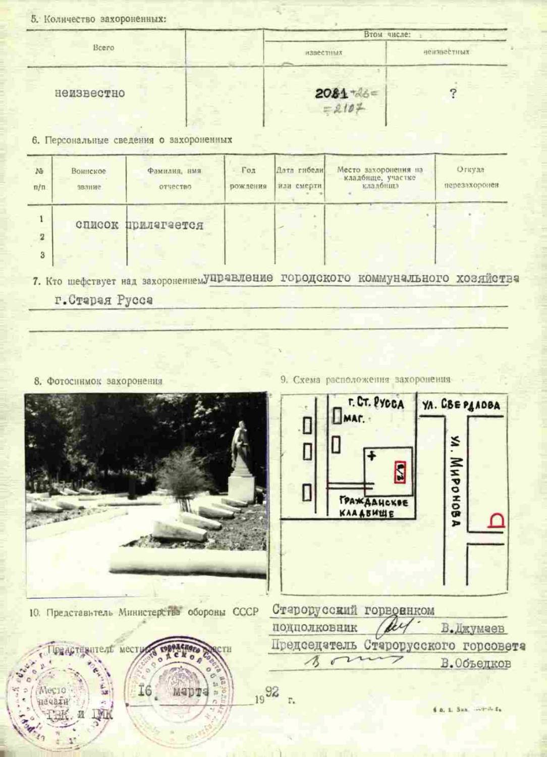 Страна захоронения Россия Регион захоронения Новгородская обл. Номер захоронения в ВМЦ 53-378 Место захоронения Старорусский р-н, г. Старая Русса Дата создания современного места захоронения __.08.1941 Дата последнего захоронения __.__.1959 Вид захоронения братские могилы Состояние захоронения хорошее Количество могил 9 Захоронено всего неизвестно Захоронено известных 2107 Захоронено неизвестных неизвестно Кто шефствует над захоронением управление городского коммунального хозяйства г. Старая Русса Откуда производились перезахоронения д. Крекша; д. Балагижа; д. Талыгино; д. Отвидино; д. Медведно; д. Григорово; д. Трифаново; д. Городская; д. Слобода; д. Гушино; д. Брешная Гора; д. Парфеево; д. Заболотье; д. Кочериново