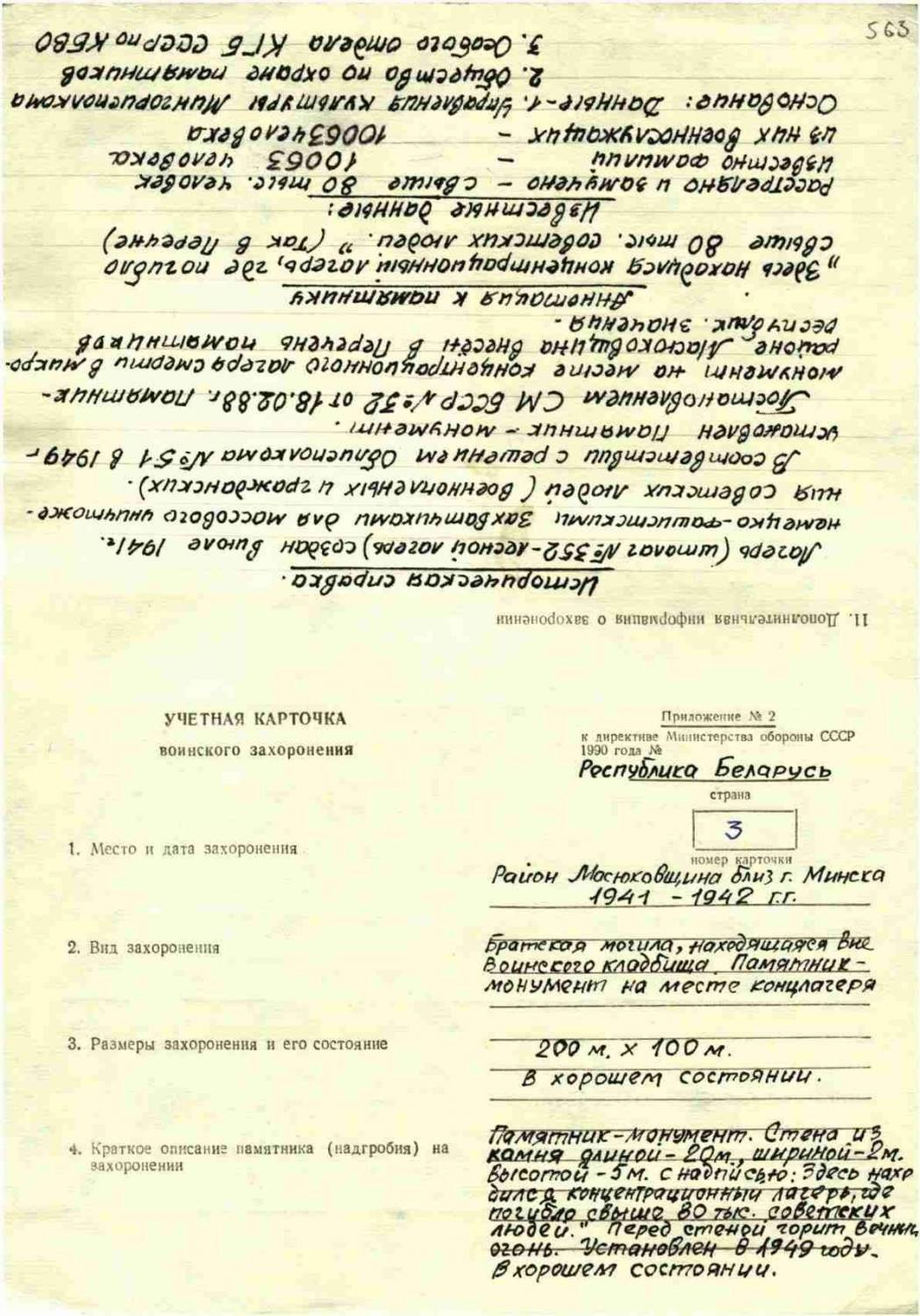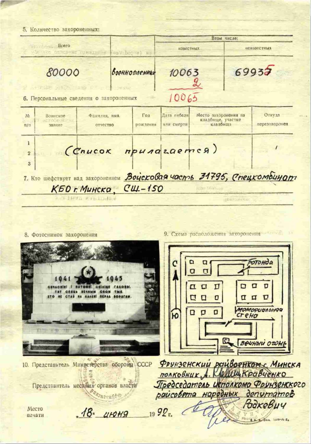 Страна захоронения Беларусь Номер захоронения в ВМЦ З375-563 Место захоронения Масюковщина р-н, близ г. Минска Дата создания современного места захоронения __.__.1941 Дата последнего захоронения __.__.1942 Вид захоронения братская могила Состояние захоронения хорошее Количество могил 1 Захоронено всего 80000 Захоронено известных 10065 Захоронено неизвестных 69935 Кто шефствует над захоронением в/ч 31795; спецкомбинат КБО г. Минска; СШ-150
