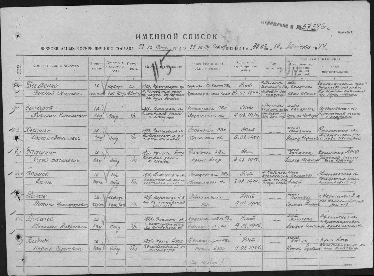1.Скрипниченко Сергей Васильевич 1917 года рождения г. Баку. Призван в армию 1939 году, последнее письмо полученное от него 8 июня 1941 года, почтовый ящик: БССР Балостокская обл. гор Ломжа, п/о Визно п/я №2 кв 8. Жена Скрипниченко Фаина, проживала в г. Баку.В письме он написал, что получил младшего командира.