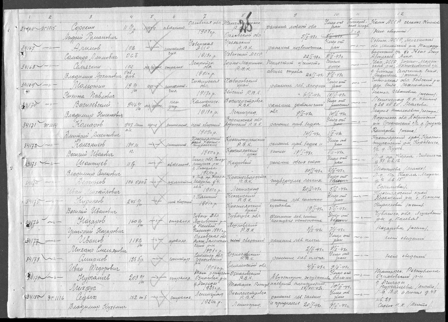 Цитата (mira) Я разыскиваю местозахоронения моего деда Хмелева Гавриила Иннокентьевича 1923 г.р., погибшего в 1943г. Был он младшим лейтенантом,командиром огневого взвода отдельного артиллерийского дивизиона 37-ой отдельной стрелковой бригады, которая входила в состав 3-ей ударной армии Калининского фронта. Полевая почта 1538, в/ч 368. Призывался в 1941 г. Енисейским райвоенкоматом. Долгое время считался пропавшим без вести и только недавно его имя было занесено в красноярскую электроннуюкнигу памяти, как погиб в бою 11 марта 1943 г. Может по месту дислокации его военной части в марте 1943 г. можно определить его последнее место боя? Увы, всё не так просто... Согласно официальному приказу об исключении из списков, Ваш дед пропал без вести в марте 1943 года. Дата не указана. Книги Памяти, по части достоверности заставляют сильно сомневаться. Например мой дядя по данным Книги Памяти погиб за полгода до того, как это произошло фактически и призывался совсем в другом населенном пункте. Не редкость дублирование или отсутствие человека. Приблизительное место гибели установить возможно. Посмотреть, (через интернет хотя бы) боевой путь 3-й Ударной в феврале-марте 1943 года, постараться найти карты боевых действий и операций. Отдельная бригада - достаточно серьёзное соединение, чтобы быть отмеченной на них. А после этого неплохо было бы посмотреть, хотя бы через ОБД "Мемориал" именные списки захоронений в этой, и близлежащих местностях. Иногда бывает, что человек похоронен без указания имени и отчества, да еще и фамилия записана с ошибкой.