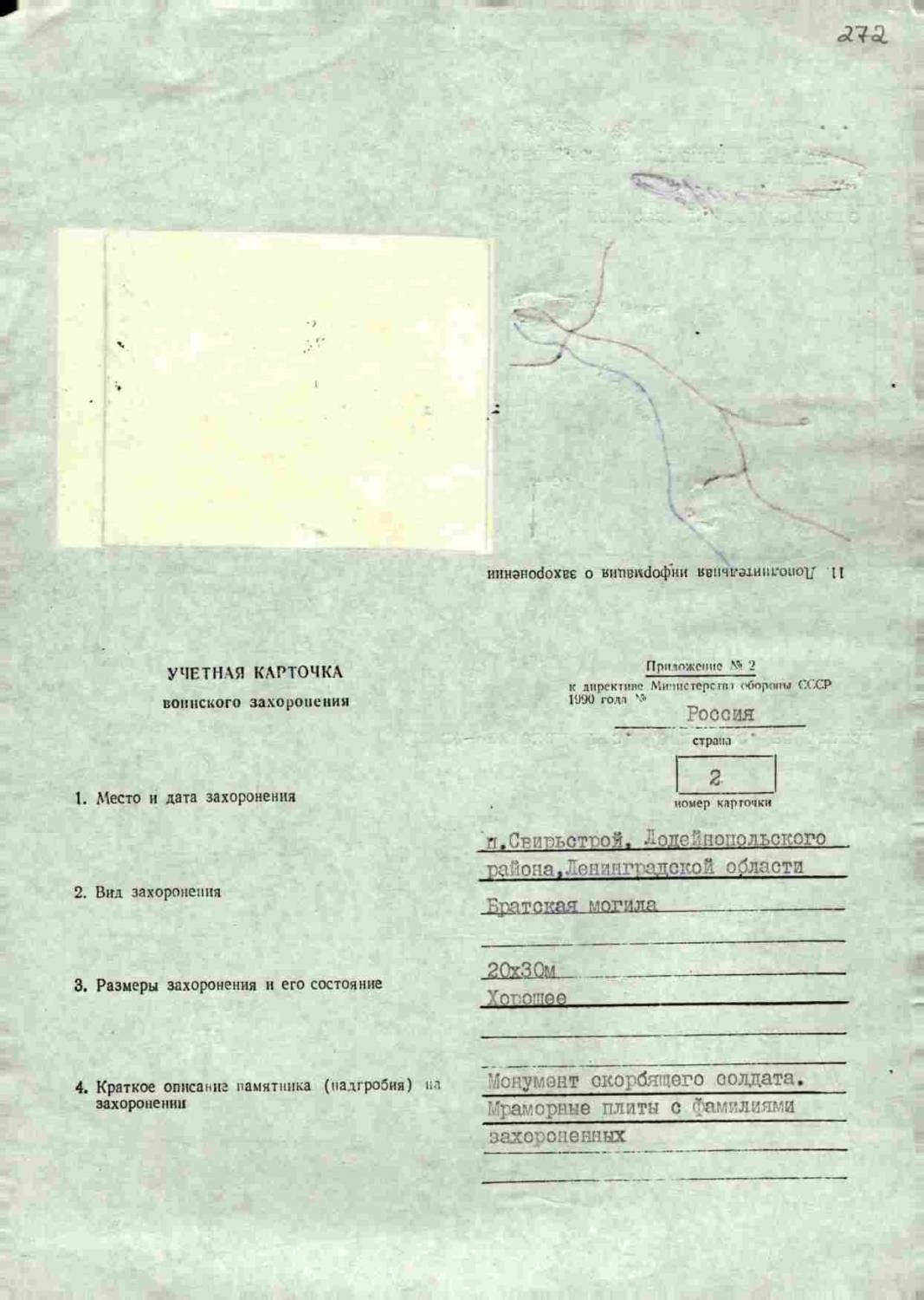 ТатьянаБ, ПОСМОТРИТЕ ЗДЕСЬ Страна захоронения Россия Регион захоронения Ленинградская обл. Номер захоронения в ВМЦ 47-272 Место захоронения Лодейнопольский р-н, п. Свирьстрой Вид захоронения братская могила Состояние захоронения хорошее Количество могил 1 Захоронено всего 719 Захоронено известных 694 Захоронено неизвестных 25 Кто шефствует над захоронением Нижне-Свирский шлюз; мэрия п. Свирьстрой